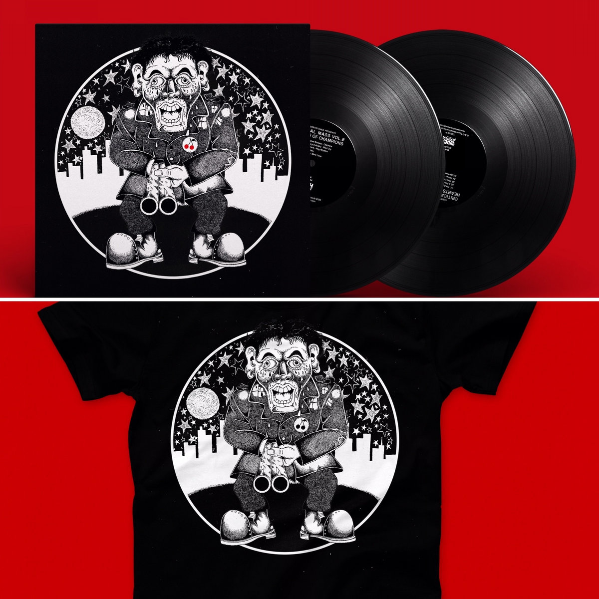 Gatefold Double LP and limited T-Shirt. Artwork by Tin Savage. Hand-screened on Gildan Heavies by Vino Sangre.